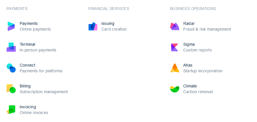 Esta es la mayor parte de los ingresos de Stripe, gestionando transacciones de pago a través de Internet. Se trata de cinco productos de procesamiento de pagos: